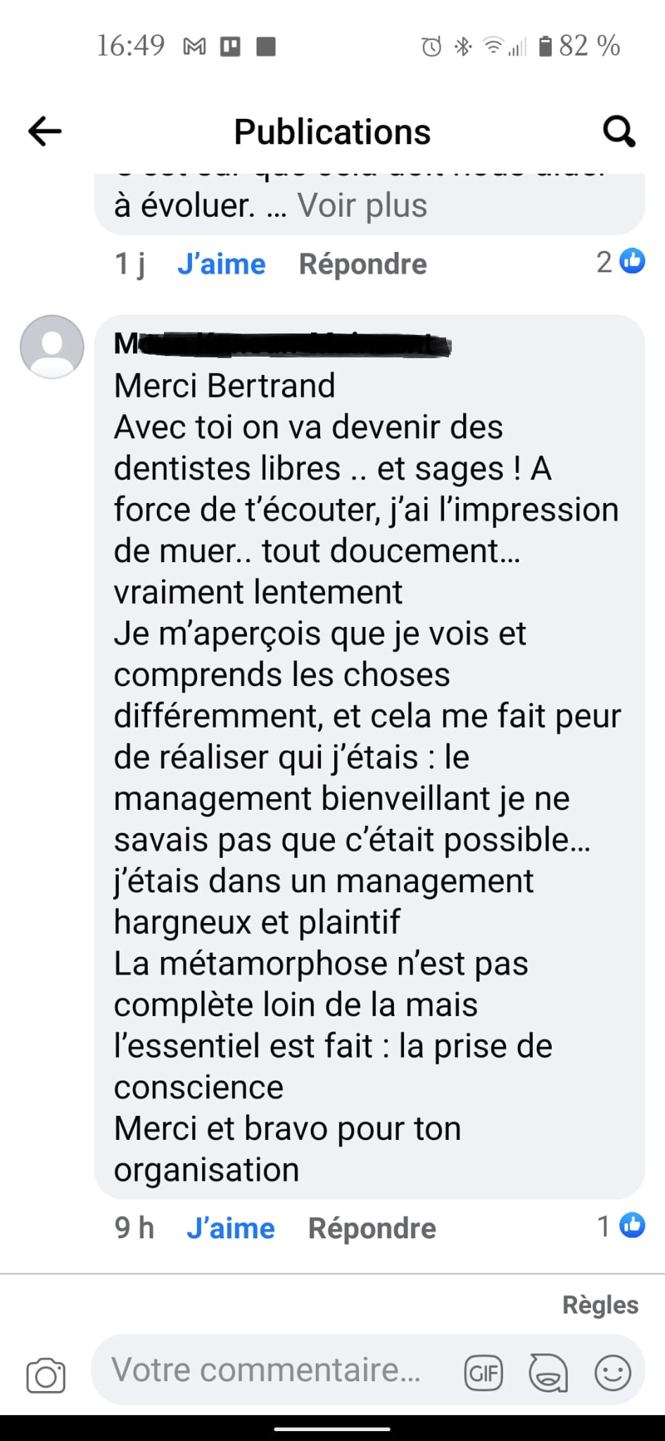 Je façonne mon état d’esprit et transforme la manière de gérer mon cabinet dentaire IES, situé en zone semi rurale à Ambérieux-en-Bugey, en périphérie de Lyon. Il se développe ensuite de manière progressive et constante, depuis plus de 24 ans maintenant, et fédère une équipe de 20 personnes, motivées et soudées.